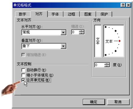 步骤二、单击行号1,确保选定新行,然后右击鼠标进入快捷菜单,接着从中选择“设置单元格格式”命令,然后在“单元格格式”对话框中选择“对齐”选项卡,并参见图 28,打开“合并单元格”检测框,最后单击“确定”按钮。