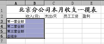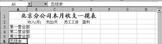 步骤二、在B2、C2、E2、F2单元格中分别输入“收入/月”、“支出/天”、“员工工资”、“盈利”栏目名称,如图 3所示。接着分别在A3、A4、A5、A6单元格中输入“第一营业部”、“第二营业部”、“第三营业部”、“总结余”项目名。