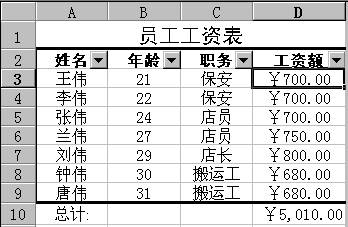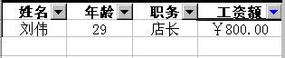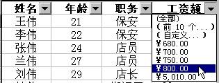 例如,这一步操作用于指查看工资额为800元的员工,操作结束后,它就会显示在屏幕上,如图15所示,这就是自动筛选的结果。